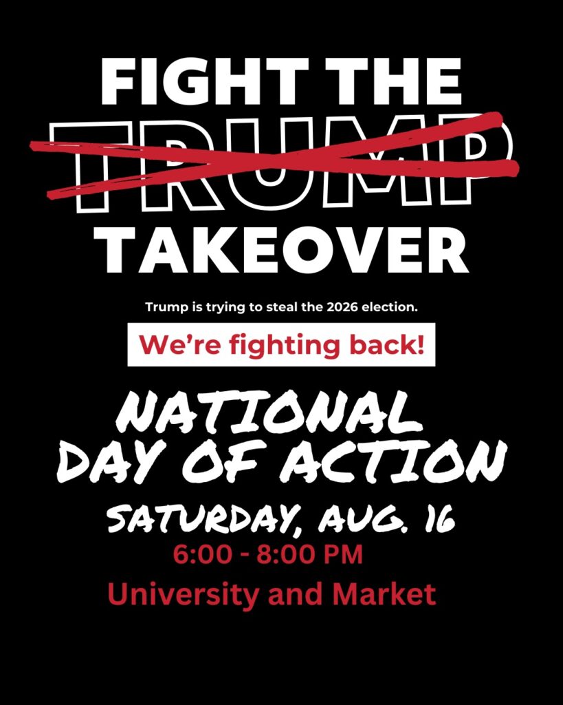 Trump is trying to steal the 2026 election by rigging the system and changing electoral maps. He started in Texas, but he won’t stop there. We are fighting back. Join a stop the Trump Takeover event near you!