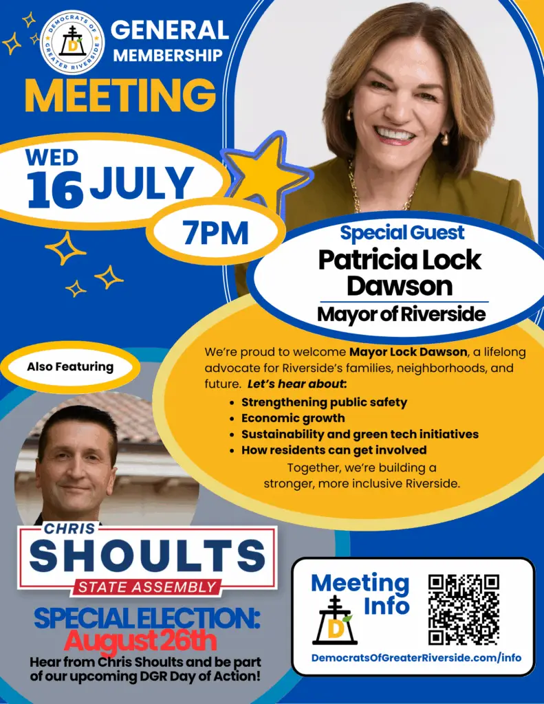 We’re gearing up for a powerful and inspiring evening at the Democrats of Greater Riverside’s July 16th meeting — and you won’t want to miss it.