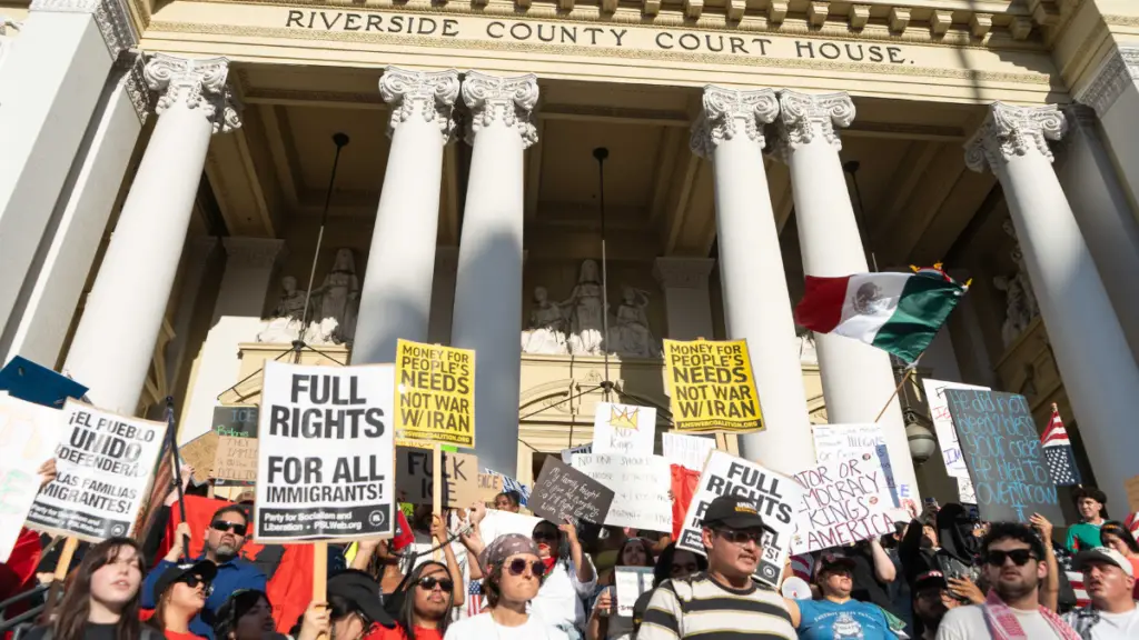 It’s also the second protest to take place in downtown Riverside in two days, targeting the Trump administration. Around 300 protesters marched through downtown Riverside for hours in response to recent U.S. Immigration and Customs Enforcement raids Friday afternoon.